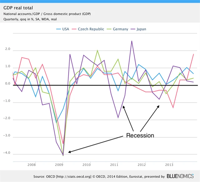 HDP je měřítkem ekonomické aktivity v dané zemi či regionu. Pohled na změny v reálném HDP umožňuje znát pozici ekonomiky v hospodářském cyklu, tedy zda se ekonomika nachází ve fázi recese, nebo expanze. Recese je obvykle definována jako dvě po sobě jdoucí čtvrtletí negativního hospodářského růstu (v mezičtvrtletním srovnání). Z tohoto pohledu je důležité sledovat dynamiku reálného HDP, tedy očištěného o efekt cenových změn, aby byl vyloučen dopad inflace či deflace na růst HDP. Součet změny reálného HDP a inflace se zhruba rovná změně nominálního HDP.