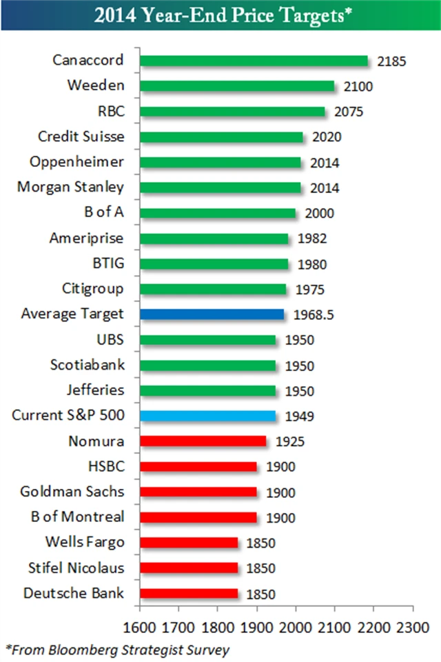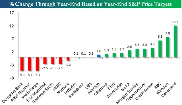 Uvidíme, jak rychle se stratégové a analytici nechají "vycukat". V týdnu (v úterý) bylo hned 7 z 20 cílových cen pro konec roku nižších než cena současná. "Podstřelovaly" například Goldman Sachs, Wells Fargo nebo Deutsche Bank. Wells Fargo, Stifel Nicolaus a Deutsche Bank byly v té době přitom největšími pesimisty na trhu. Největším býkem byla naopak společnost Canaccord s cílovou cenou 2 185.