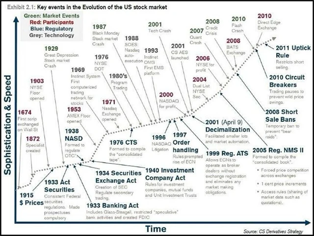 První obchod na Wall Street proběhl fakticky už v roce 1674. Od té doby rychlost obchodování nabírá na obrátkách. Analytici z Credit Suisse sestavili graf, který ukazuje celou historii burzy a všechny změny a inovace, jež ji zasáhly od 17. století až do současnosti.