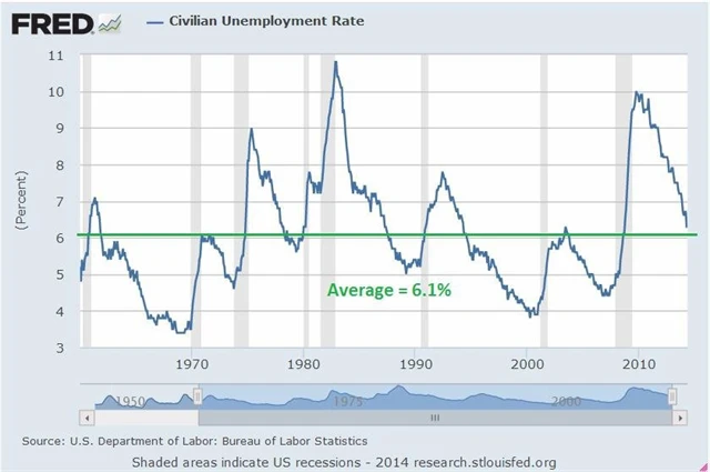 Perfektním příkladem toho, že nejlepší je investovat, když je nejhůře, je vývoj nezaměstnanosti v USA. Z grafu je patrné, že nezaměstnanost osciluje kolem dlouhodobého průměru 6,1 %. Mimochodem právě nyní se k tomuto průměru navrací.