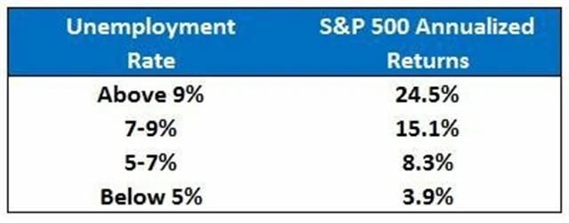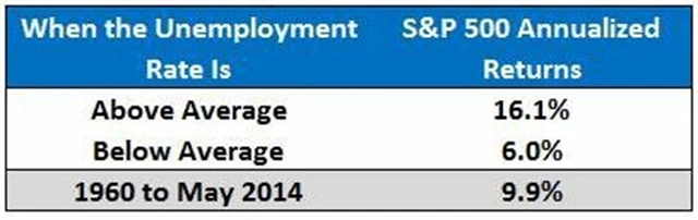 Když se podíváme na výkonnost indexu S&P 500 v období, kdy byla nezaměstnanost nad průměrem, a v období, kdy byla podprůměrná, dojdeme k poměrně jasným výsledkům - v době vysoké nezaměstnanosti je lepší výkonnost akciového trhu. Průměrný roční výnos indexu S&P 500 je při nadprůměrně vysoké míře nezaměstnanosti 16,1 %, při podprůměrné jen 6 %.