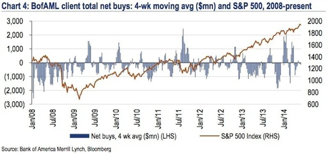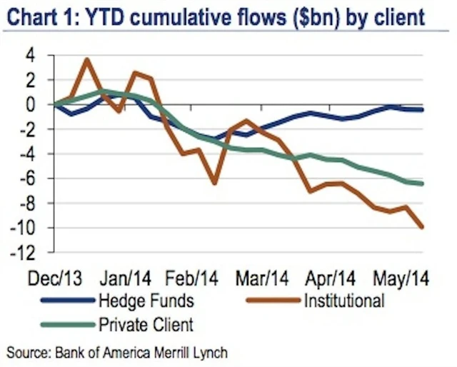 Následující graf z dílny Bank of America Merrill Lynch zobrazuje peněžní toky klientů banky investujících do akcií (včetně hedgeových fondů a institucionálních a privátních klientů) za posledních šest let. Ukazuje, že většina z nich rally celkem jasně (po)minula.