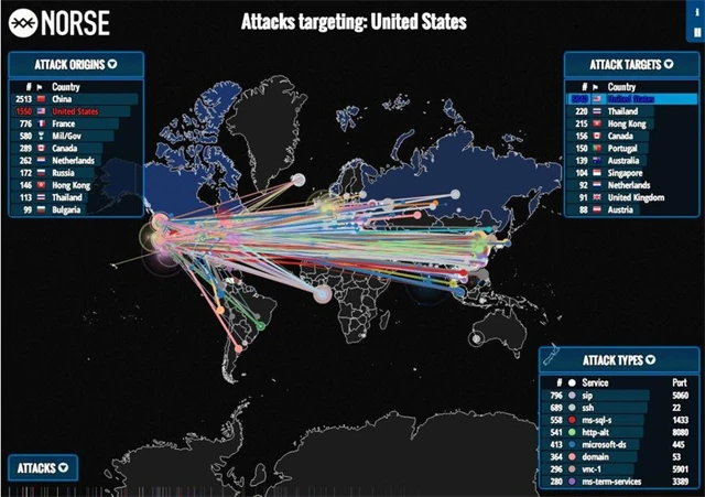 Americká počítačová společnost Norse zveřejnila živou mapu, která v aktuálním čase zobrazuje útoky hackerů na celém světě. Spojené státy jsou přitom cílem číslo jedna. Během pouhých 45 minut na ně proběhlo necelých 6 tisíc útoků.