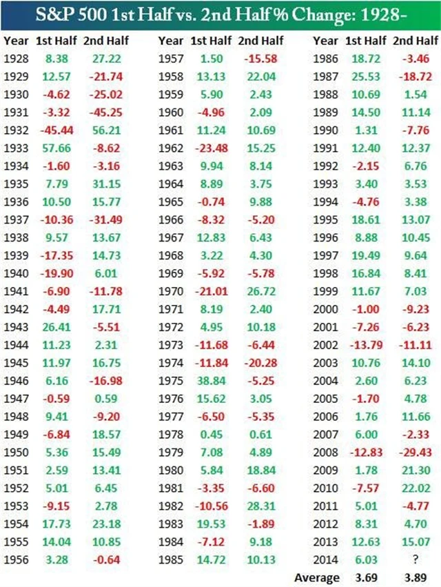 Index S&P 500 v průměru v prvních pololetích zhodnocuje o 3,69 %, v druhých polovinách roku je jeho výkon ještě lepší (3,89 %). Pokud v pondělí neodepíše přes procento, bude letošní rok čtvrtý v řadě s více než 5% ziskem v prvním pololetí.