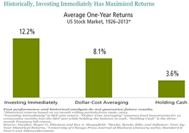 Seth Masters z AllianceBernstein se ponořil do statistik od roku 1926, aby zjistil, jak na tom pravidelné investování (do amerických akcií) je ve skutečnosti. Efekt průměrování ceny nezpochybnil, zjistil ale, že jednorázový nákup akcií je výnosnější!