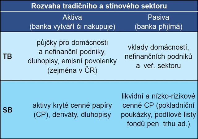 Zásadní rozdíl mezi tradičním a stínovým bankovnictvím spočívá ve zdrojích, kterými financují své aktivity. Zatímco tradiční banky se spoléhají na vklady fyzických a právnických osob, jimiž financují především úvěry, stínové banky přijímají likvidní cenné papíry a kromě zprostředkovávání úvěrů mají tendenci s cennými papíry i obchodovat.