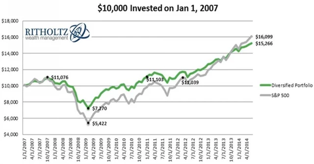 Během poslední finanční krize diverzifikované portfolio (30 % S&P 500, 30 % neamerické akcie a 40 % pevně úročené cenné papíry - Barclays Aggregate Bond Index) ztratilo méně než široký americký akciový index a dříve (o 14 měsíců) se vrátilo na předkrizovou úroveň. To vše za nižší celkové volatility.