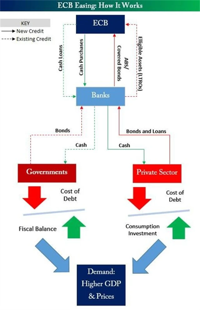 ECB na to jde mnohem příměji než americký Fed s několika koly kvantitativního uvolňování. Evropští centrální bankéři doufají, že rozproudí úvěrovou aktivitu v celé ekonomice eurozóny tím, že bankám poskytnou koncový trh pro úvěry, lépe řečeno pro balíky těchto úvěrů (pro kryté dluhopisy a ABS). Zda to otevře úvěrové kohouty, není jasné, ale zkusit se musí všechno - objem úvěrů domácností klesá od roku 2008 a od roku 2012 ubývá i emisí korporátních dluhopisů.