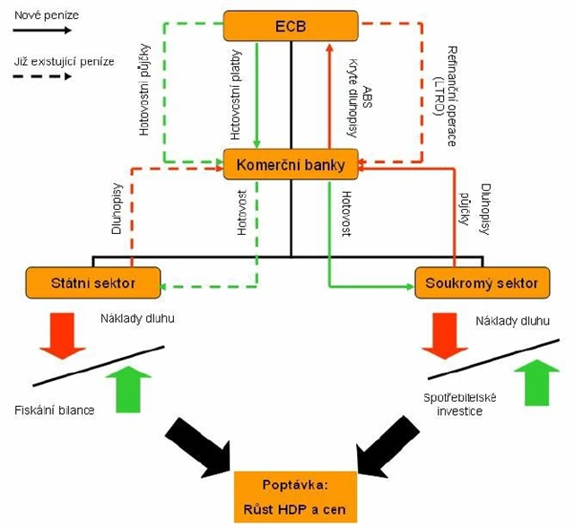 Níže uvedený diagram zobrazuje, jak mají nové programy ECB fungovat. Jak budou účinné, záleží hlavně na tom, kolik bude ECB ochotna nakupovat. Program nákupů ABS bude pravděpodobně větší podporou pro trh než nákupy krytých dluhopisů. Díky nákupům ABS centrální bankou totiž tyto cenné papíry mizejí z rozvah komerčních bank, zatímco kryté dluhopisy mají tu vlastnost, že i po prodeji v rozvaze emitenta zůstávají. Vzhledem k nízké kapitálové vybavenosti bank v eurozóně mají proto menší stimulativní dopady na úvěrovou aktivitu.