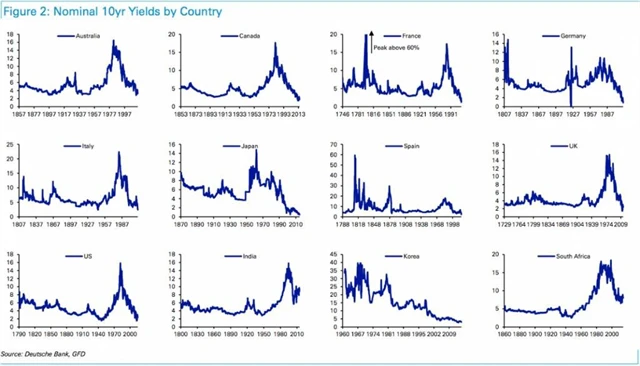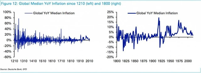 Při pohledu do historie Reid zkoumá vývoj inflace od roku 1210 a od roku 1800. Podle něj je moderní peněžní systém svázán s inflací, protože je méně navázán na ceny drahých kovů. "Dlouhodobý investor má důkaz, že žijeme v inflačním světě, a proto by měl přistupovat k současným nízkým výnosům z dluhopisů s obezřetností," píše Reid.
