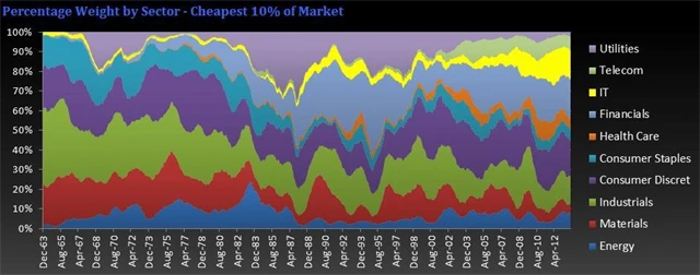 Jedním ze zajímavých vedlejších efektů hodnotového investování vždy bylo silné podvážení technologického sektoru v portfoliu. Pokud použijete jednoduchou hodnotovou strategii a kupujete vždy 10 % nejlevnějších akcií (dle různých ukazatelů - P/S, P/E, EBITDA/EV), bude se vaše portfolio, co se zastoupení různých oborů týče, vyvíjet tak, jak ukazuje následující graf.
