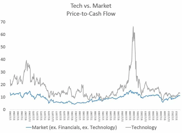 Podívejme se na technologické akcie s pomocí ukazatele poměru ceny a cash flow (P/CF). Graf ukazuje vývoj tohoto ukazatele u technologických akcií a u zbytku trhu (všechny netechnologické a nefinanční akcie).