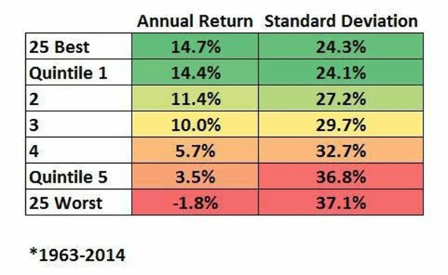 Tabulka ukazuje historickou výkonnost technologických akcií rozdělených do kvantilů a jejich roční výnosy a směrodatné odchylky. Vidíte, že levné technologické akcie dokázaly ročně vydělat 14,5 % ročně při mnohem nižší volatilitě, než jaká byla k vidění ve zbytku sektoru.