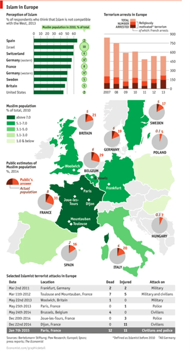 Podle počtu případů vyšetřovaných Europolem roste nebezpečí islamistických teroristických útoků na starém kontinentu, větším nebezpečím jsou ale údajně stále útoky motivované separatismem (podle počtu zatčených osob). Lidé vůbec vnímají islám poměrně nepřesně, a nejde jen o "obsah". V průzkumu Ipsos MORI Evropané výrazně "přestřelují" realitu, pokud jde například o podíl muslimů v populaci.