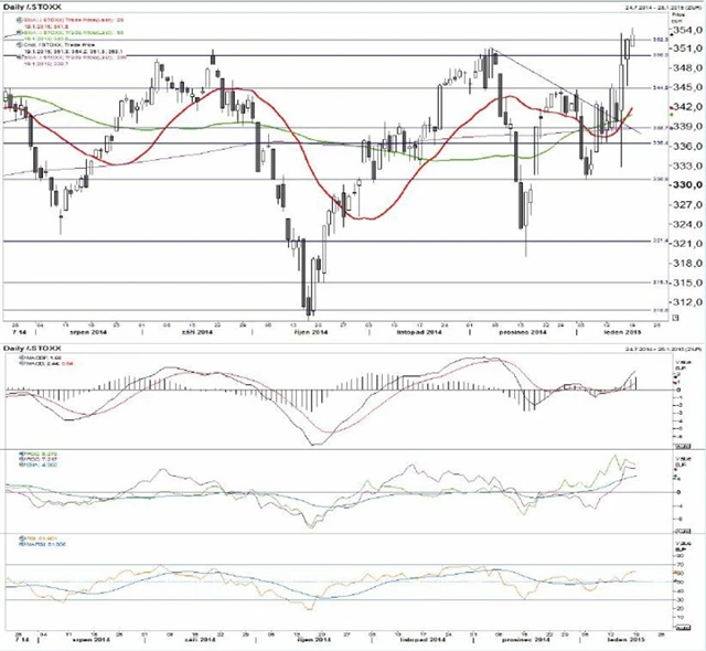 Technické indikátory se skokově zlepšily. Pro další vývoj je důležitá úroveň podpory na 350 bodech. V následujících dnech sice technicky očekáváme vývoj do strany, ale faktem zůstává, že nejdůležitější bude čtvrteční zasedání ECB.