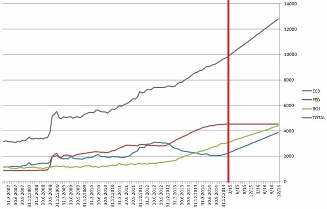 "Přestože v roce 2014 skončilo v USA kvantitativní uvolňování, na celkové situaci v oblasti globální monetární expanze se od vypuknutí finanční krize vlastně nic nezměnilo. ECB oznámila rozšíření svého programu i o státní dluhopisy členských zemí eurozóny, díky kterému bude svou bilanci navyšovat každý měsíc o 60 miliard eur minimálně do září 2016," napsal v poznámce na webu hlavní analytik X-Trade Brokers Jaroslav Brychta. "Modelový graf dalšího vývoje kumulativní bilance Fedu, Bank of Japan a ECB do konce roku 2016 za předpokladu, že Fed bude udržovat bilanci beze změny, BoJ ji bude navyšovat stejným tempem jako dosud (60 miliard USD měsíčně) a ECB tempem 60 miliard EUR měsíčně, hovoří jasně."