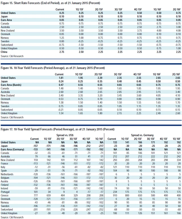 ECB představila program kvantitativního uvolňování, japonská centrální banka jej pravděpodobně rozšíří v polovině roku. "Stále čekáme, že americký Fed přistoupí k pozvolnému růstu úrokových sazeb na konci roku 2015 a Bank of England k tomuto kroku asi přistoupí až na počátku roku 2016," píší analytici ze Citigroup.