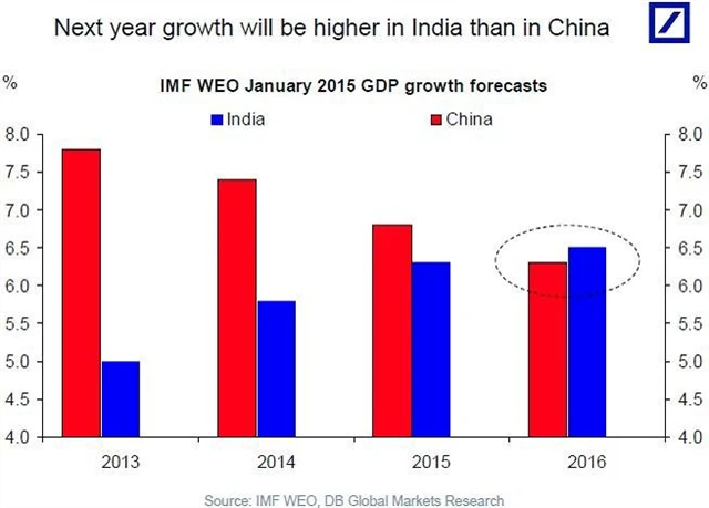 Podle aktuálního výhledu Mezinárodního měnového fondu by míra růstu HDP v Indii měla překonat tu čínskou již v roce 2016. To se nestalo už hezkou řádku let.