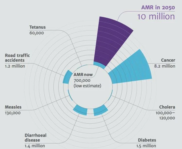 Podle britského projektu Review on Antimicrobial Resistance (RAR) se ale účinnost antibiotik kvůli jejich nadužívání prudce snižuje a v roce 2050 by podle nejnovějších predikcí mohlo každý rok na různá onemocnění dnes běžně a úspěšně léčená antibiotiky zemřít až 10 milionů lidí.
