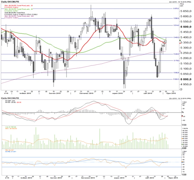 Technická analýza cen akcií ČEZ a Komerční banky. (6. 10. 2015)
