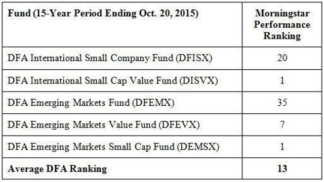Tabulka níže ukazuje 15letou percentilovou výkonnost pro fondy Dimensional Fund Advisors zaměřené na small caps. Sledované 15leté období v tabulce končí 20. říjnem 2015 (jednička je nejvyšší hodnocení).