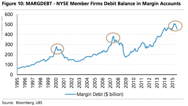 Vedle toho začal klesat takzvaný margin debt, tedy objem peněz, které si členové burzy NYSE půjčují na nákupy akcií. Čím více peněz si půjčují, tím lépe zpravidla pro akcie. Tedy dokud se příliš nenafoukne případná cenová bublina. Pokles margin debt v posledních týdnech sice zatím znamená jen drobnou korekci, dluhy na nákupy akcií v posledních letech narostly na rekordní úroveň, ovšem o letech 2000 a 2007 bylo možné říci prakticky totéž.