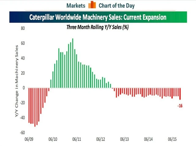 Globální těžební a stavební průmysl je v útlumu kvůli poklesu cen komodit, zpomalení v Číně a silnému dolaru. Měsíční poklesy v prodejích společnosti Caterpillar tuto situaci přesně vystihují.