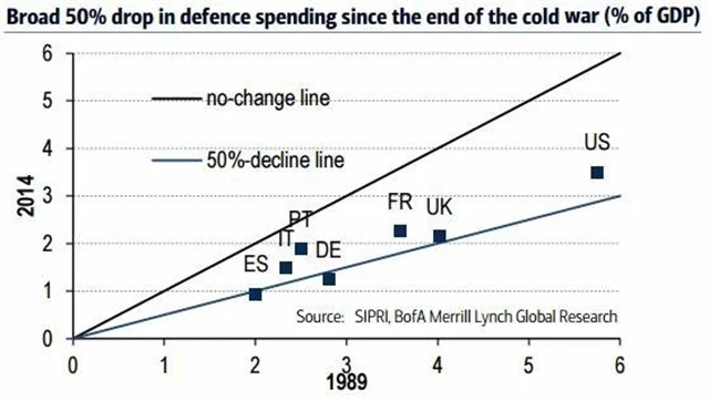 Zpráva analytiků z BoAML uvádí, že "výdaje na obranu zřejmě dosáhly dna, přičemž v případě mnoha zemí se pohybují pod 2 % HDP, což je minimální úroveň, k jejímuž plnění se státy zavazují při vstupu do NATO". Dokument dále vypočítává, že kdyby Německo na obranu od konce studené války posílalo stejné objemy peněz jako Francie, měly by dnes tyto dvě země stejnou míru zadlužení v poměru k HDP.