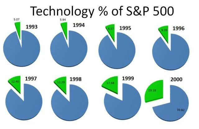 V roce 1991 byla průměrná změna vah sektoru S&P 500 meziročně jen 0,34 %. V obdobích 1998-1999 a 1999-2000 ale zažil technologický sektor takový boom, že se jeho sektorová váha zvedla o 44 %, respektive 65 %.