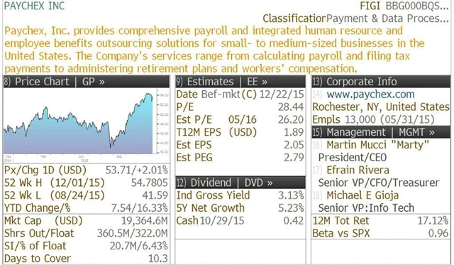 Tato akcie je dalším skokanem roku, co se výkonnosti týče. V letošním roce si zatím připisuje kolem 15 % bez započtení dividend. Zabývá se zpracováním výplat zaměstnanců a zapojuje se i do dalších HR řešení pro malé a střední podniky. Těží tak ze zotavení amerického pracovního trhu, poklesu nezaměstnanosti a oživení ekonomiky.