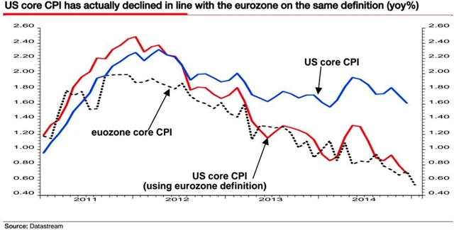Albert Edwards z francouzské banky Société Générale upozorňuje, že nesoulad mezi inflací ve Spojených státech a Evropě je pouze a jen důsledkem používání jiných metodik výpočtů vývoje cen.
