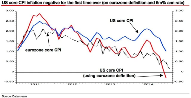 "A kdybychom navíc vývoj jádrových cen ve Spojených státech a eurozóně srovnávali v šestiměsíčním horizontu, dostali bychom výsledek, podle kterého je již nyní deflace v USA hlubší než v Evropě," dodává Edwards.