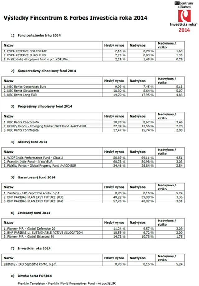 Společnost Fincentrum a odborný měsíčník Forbes 27. ledna 2015 v hotelu DoubleTree by Hilton představily výsledky 5. ročníku analýzy slovenského investičního trhu podílových fondů Fincentrum & Forbes Investícia roka 2014. V kategorii Akciový fond 2014 se vítězem stal WIOF India Performance Fund – Class A.