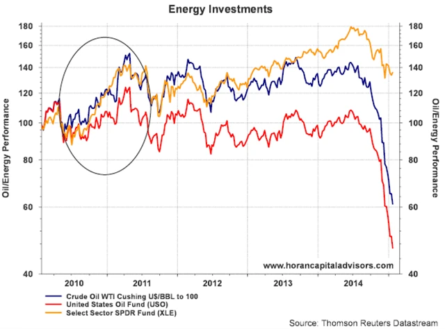 Podívejte se na graf United States Oil ETF (USO) a Energy Select Sector SPDR Fund (XLE) a ceny ropy WTI. Je patrné, že XLE (oranžová křivka) výkonností překonává USO (červená křivka) od doby, kdy v roce 2010 začalo docházet k růstu cen ropy (označeno kroužkem).