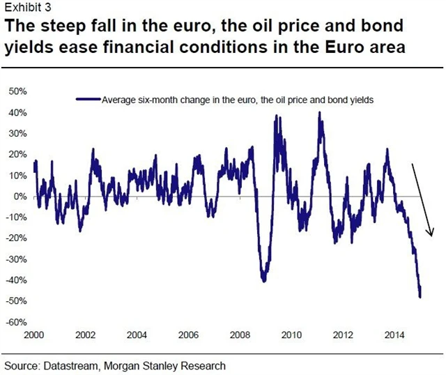 Za šest měsíců cena ropy klesla o 55 %, euro oslabilo o 15 % a výnosy německých 10letých státních dluhopisů poklesly taktéž, konkrétně o 80 bazických bodů. Znamená to nejvýraznější uvolnění finančních podmínek v eurozóně od doby, kdy byla v roce 1999 zavedena společná evropská měna.