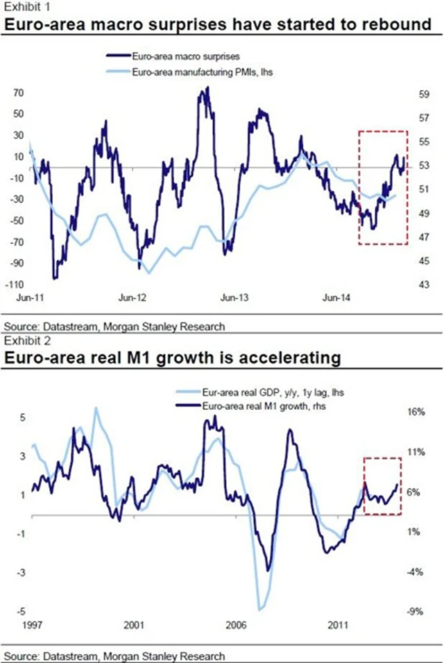 Podle aktuálního reportu Morgan Stanley si evropské akciové trhy pravděpodobně užijí v roce 2015 silnou rally. Analytik Sebastian Raedler a jeho kolegové argumentují zlepšujícím se makroekonomickým prostředím, nastartováním evropského QE a uvolněním rizikových prémií.