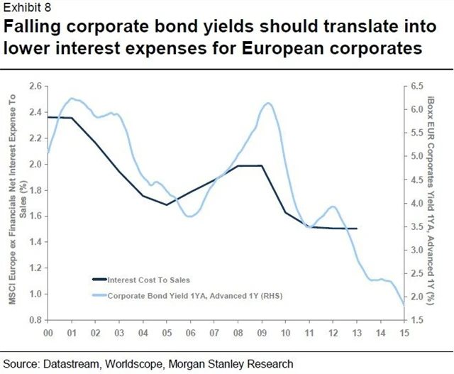 Kvantitativní uvolňování stlačilo výnosy korporátních dluhopisů investičního stupně na historické minimum 1,2 % a také na sedmileté minimum ve srovnání s americkými korporátními dluhopisy (v současnosti vynášejí 2,75 %). Pokles nákladů na dluhovou službu ve vztahu ke klesajícím korporátním dluhopisovým výnosům mezi lety 2009 a 2013 v USA pomohl vytáhnout marže na 60letá maxima. Výhoda z nižších výpůjčních nákladů se nyní začíná projevovat v Evropě a měla by letos zvýšit evropské zisky minimálně o 2 %.
