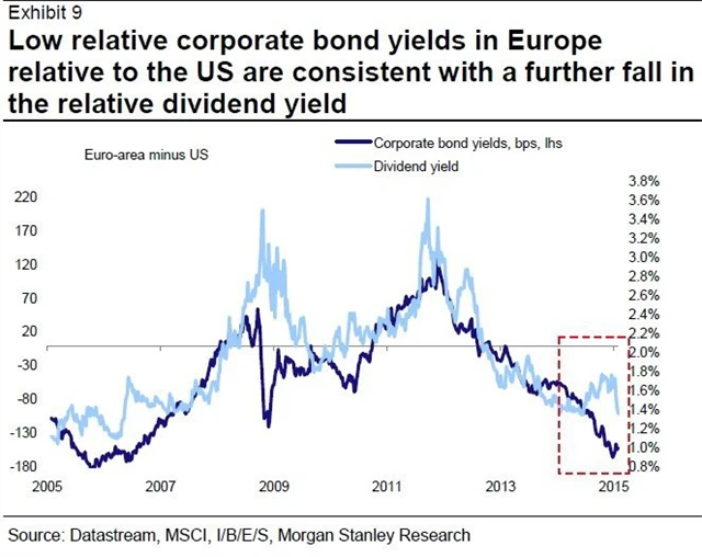 Analytici z Morgan Stanley upozorňují na to, že zatímco Fed dokončil svůj program nákupu aktiv, ECB ho teprve odstartovala (celkově má mít objem bilion eur). Investoři věří, že pozitivní dopady na ekonomiku, které má QE přinést, ještě nejsou v cenách evropských akcií plně zahrnuty.