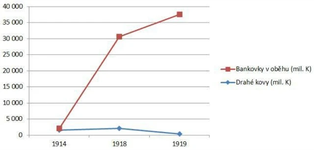 Obrázek 1: Ještě v roce 1914 existoval zájem spravovat zdravou měnu krytou zlatým pokladem. V průběhu válečného období klesl zlatý poklad o 80 %, množství oběživa ale o více než 1 700 % vzrostlo.