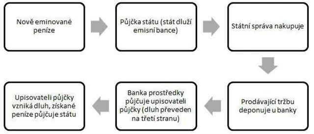 Již v prvních měsících války si mocnářství u své emisní banky vypůjčilo 2 600 milionů korun. Řekněme, že si státní správa koupila od továrníka ze zásob boty a zaplatila bankovkami, které získala půjčkou od rakousko-uherské emisní banky. Továrník tržbu uložil jako vklad u své banky, která tyto peníze záhy půjčila upisovateli válečné půjčky, tedy někomu, kdo půjčuje státu. Dluh státu vzniklý koupí bot zůstal nezměněn, změnila se jen forma financování – z bankovek, které se vrátily do rakousko-uherské banky, se stala válečná půjčka a z dluhu bance se stal dluh na bedrech majitele půjčky. Monetizovaný dluh tak byl emisní bance formálně splacen.