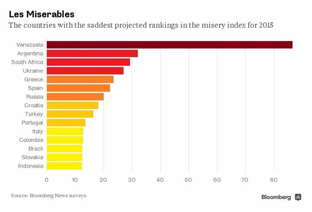 Analýza zahrnující 51 světových ekonomik (včetně eurozóny) hovoří jasně - takzvaný index bídy pro rok 2015 je v případě Venezuely více než 50krát vyšší než u "nejšťastnějšího" Thajska. Odhaduje se, že inflace v jihoamerické zemi letos zrychlí až na 78,5 %.