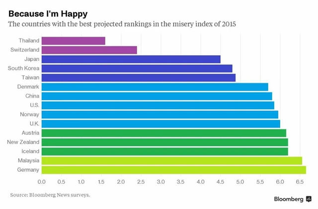 "Nejšťastnější" ekonomikou podle indexu je překvapivě Thajsko, které vykazuje nezvykle nízkou míru nezaměstnanosti pod 1 %. V nepříliš bohaté zemi ale po loňském vojenském převratu platí stanné právo, a Thajci tak mají před sebou ještě dlouhou cestu, aby zemi dostali na úroveň vyspělých ekonomik. Jejich prvenství je tedy právem v uvozovkách.