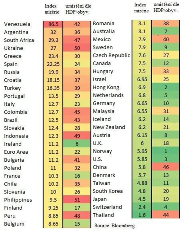 Česku patří ve srovnání HDP na obyvatele 27. příčka, je tedy přibližně v polovině žebříčku. Index bídy je v tuzemsku dokonce nižší než ve většině států Evropy i v eurozóně jako celku, ukazuje průzkum.