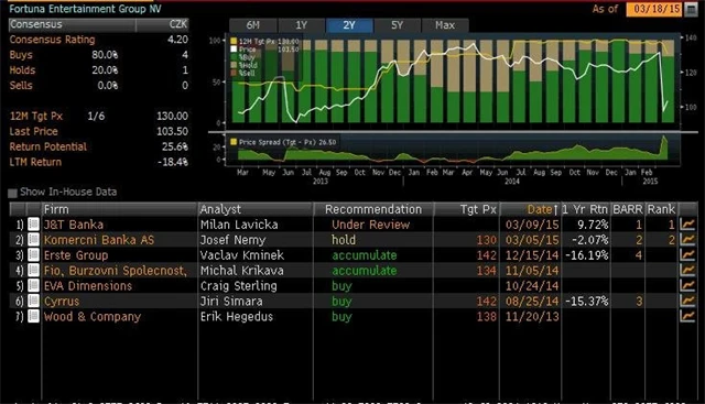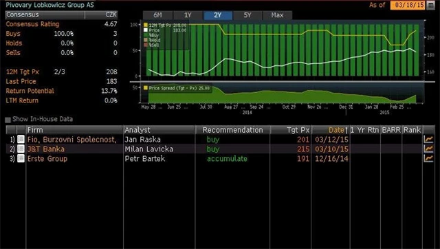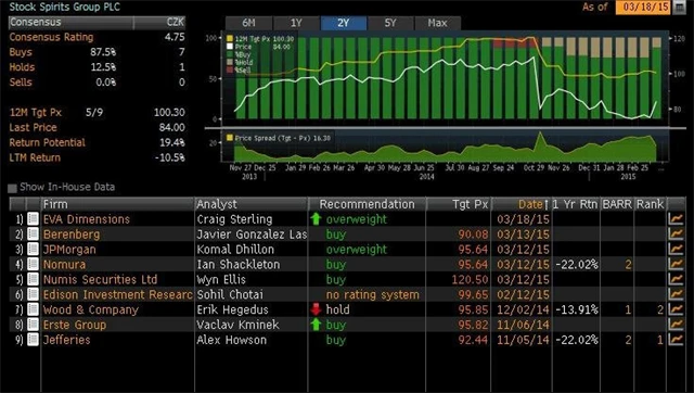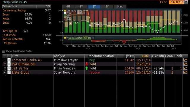Jaký názor mají na akcie Philip Morris ČR, Fortuny, Pivovarů Lobkowicz a Stock Spirits domácí a zahraniční analytici? Jaké jsou jejich 12měsíční cílové ceny a jak znějí jejich aktuální investiční doporučení? Nabízíme kompletní přehled, jak jej k 18. březnu 2015 shromáždila agentura Bloomberg.