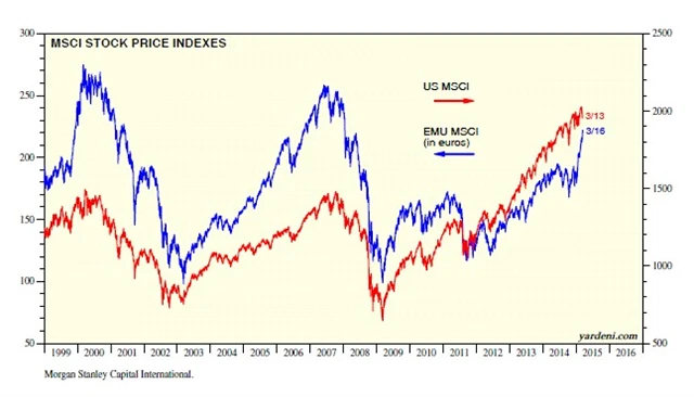 Světoví investoři se vydali na exkurzi po Evropě. Akcie na starém kontinentu díky tomu zažívají raketový růst. Index EMU MSCI (v eurech) stoupl od začátku roku o zhruba 20 %, což dalece převyšuje asi procentní zisk indexu US MSCI. Divergence je samozřejmě tažena více než 10% oslabením eura od začátku roku, ale i po očištění o slabé euro lze v Evropě zajímavě vydělat.