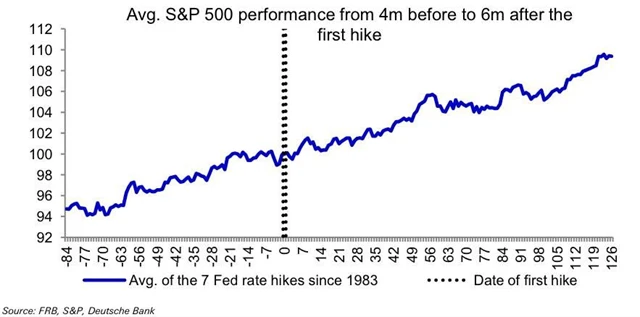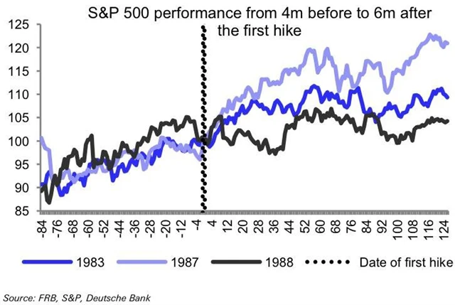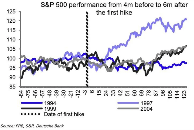 Hlavní akciový stratég Deutsche Bank David Bianco zkoumal historii zvyšování sazeb Fedu a jejich dopadů na akcie. Z následujících grafů je patrné, jak akcie na změny politiky Fedu reagovaly.