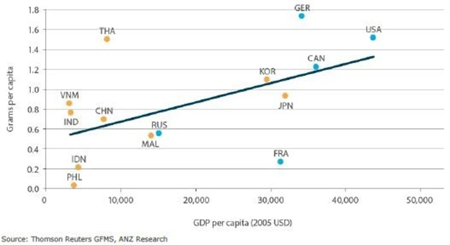 Během posledních pěti až deseti let fundamenty jako ekonomický růst a problémy finančního systému nahrávaly zlatu. Mezi rozvíjejícími se trhy v rámci skupiny, kterou ANZ označuje jako Asia 10, činila průměrná poptávka po zlatě 0,7 gramu na osobu, což je zhruba polovina spotřeby na obyvatele rozvinutějších států s vyššími příjmy (jako jsou Německo, USA, Kanada, Jižní Korea a Japonsko). Poptávka po zlatě na obyvatele na mladých trzích by se mohla zdvojnásobit díky růstu bohatství v těchto zemích a industrializaci jejich ekonomik.
