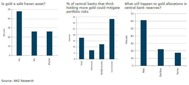 Aktuální dokument MMF napovídá, že bylo zlato centrálními bankami vnímáno jako aktivum, které lze využít k omezení rizika. Závěry plynou z průzkumu ANZ mezi centrálními bankami a manažery suverénních fondů provedeného začátkem roku 2014. Polovina respondentů považovala zlato za dlouhodobě bezpečný přístav. Kolem 60 % respondentů věří, že zlato bude během následujících dvou let tvořit větší podíl devizových rezerv centrální banky, pouhých 20 % očekává jeho pokles. Zhruba polovina oslovených je přesvědčena, že prostřednictvím zvýšení pozic ve zlatě lze zmírnit rizikovost portfolia.