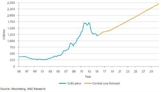 Hlavní scénář ANZ (kterému analytický tým dává 45% pravděpodobnost) předpovídá pro rok 2030 unci zlata za 2 400 USD, tedy cenu dost vysokou na to, aby stimulovala novou nabídku. ANZ má i optimističtější scénář s růstem cen k 3 000 USD do roku 2030 a pesimistický s propadem na dno pod 1 000 USD během následujících 10 let.