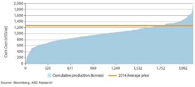 Kolem 20 % světových zlatých dolů je ziskových až při ceně nad 1 200 USD za trojskou unci. Přestože v budoucnu mohou být otevírány nízkonákladové doly, všeobecným trendem je to, že nová produkce je stále dražší. Významnější růst nabídky ze současných úrovní by vyžadoval vyšší cenu zlata. Protože je těžba stále nákladnější, lze očekávat, že stále důležitější součástí produkce bude zpracování existujícího zlata. Přilákat "zlatý šrot" na trh by ale vyžadovalo rovněž vyšší ceny. V každém případě se však nákladová křivka dostává k prahu ceny zlata kolem 1 000 USD za trojskou unci.